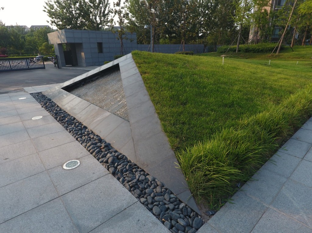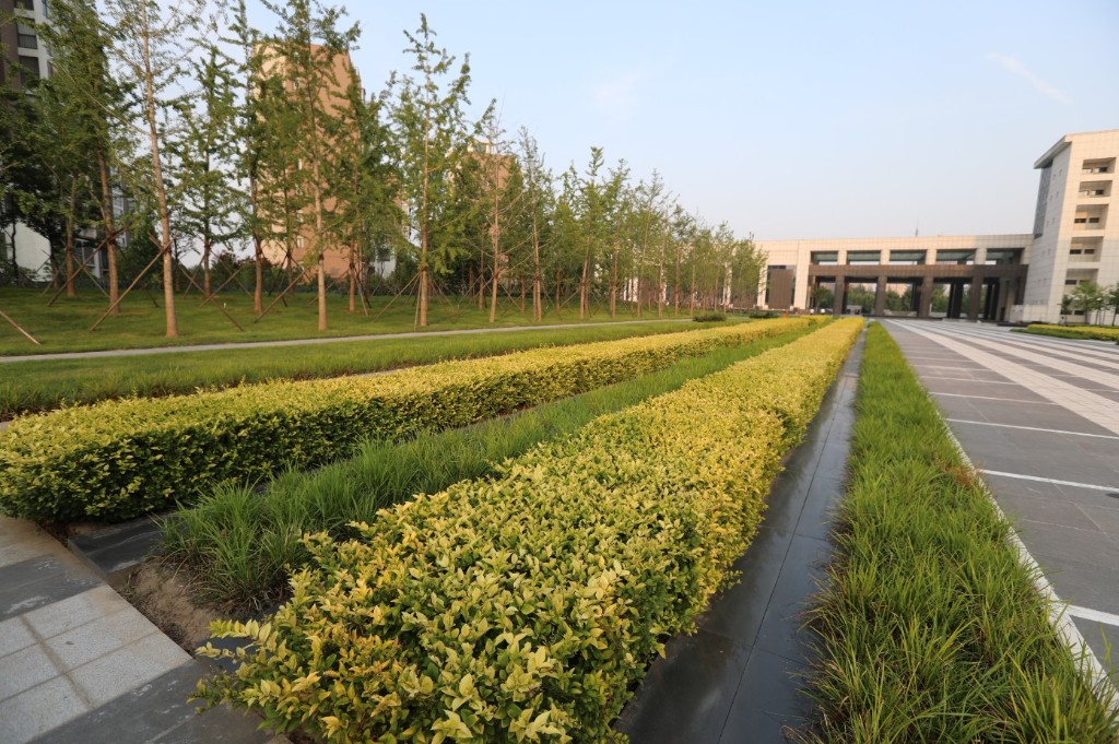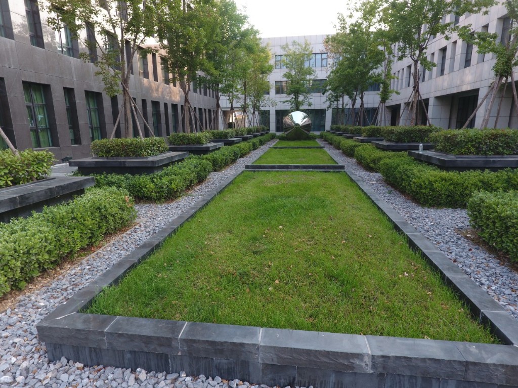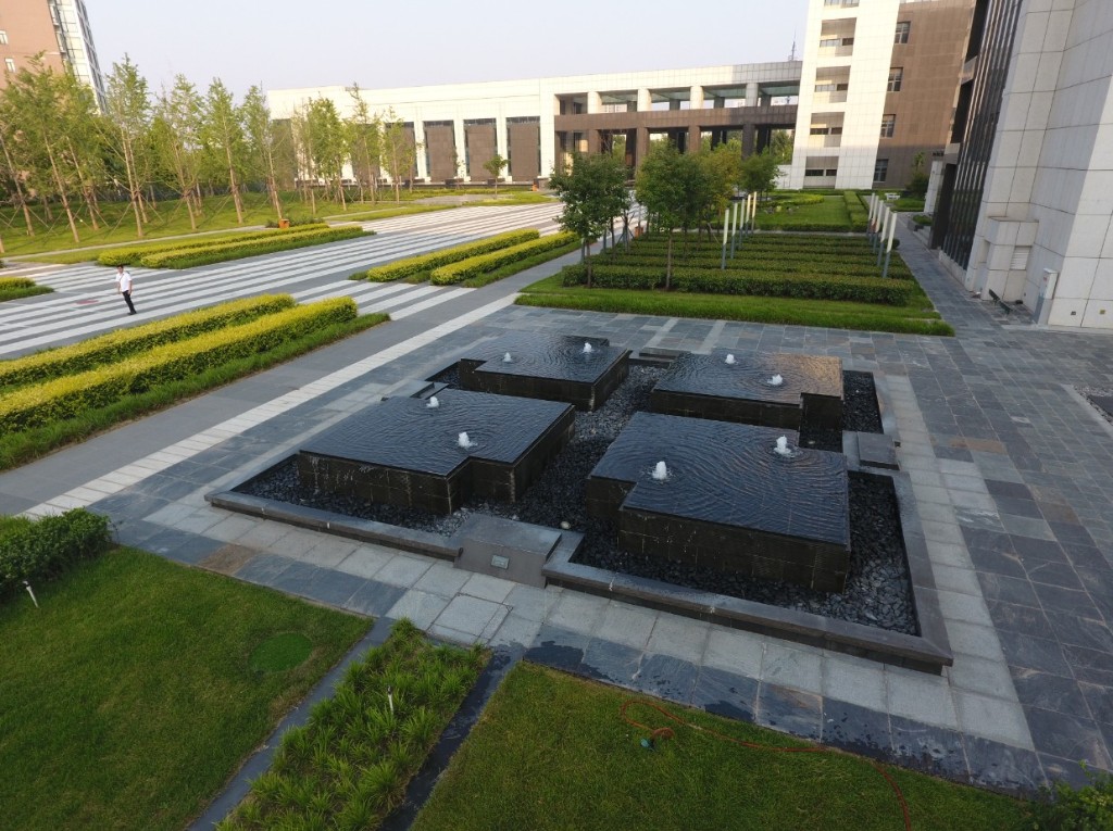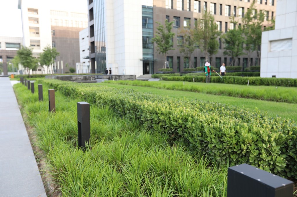 場地采用幾何式的線條設計,利用植物、水景等景觀元素劃分出不同的功能空間,簡潔明快,充滿現代氣息。道路結合植物做到人車分流,保障行人的安全。將商務區與其他樓連接在一起,創造出令人舒適的小尺度空間,鞏固了人與人之間的親密感受。大小空間的連接處由水景作為過渡,形成視覺焦點,豐富空間層次。